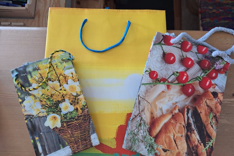 Aus alten Bildkalendern basteln wir Tüten in verschiedenen Designs und unterschiedlichen Größen. Gegen eine Spende können Sie sich eine Tragetasche mitnehmen.